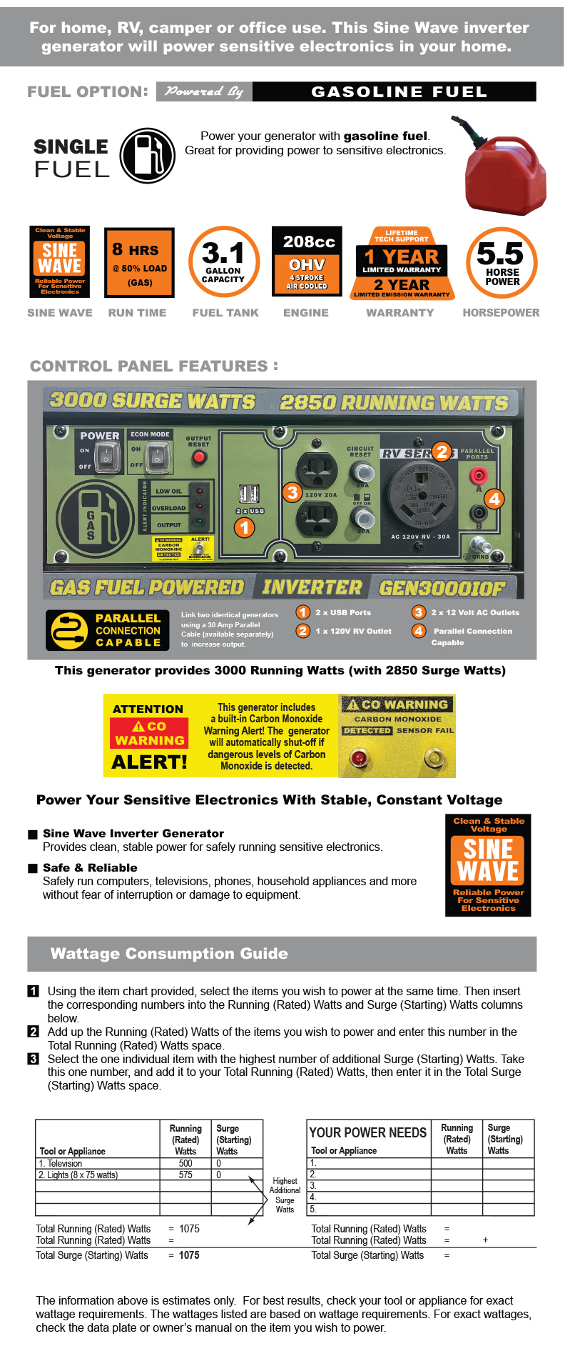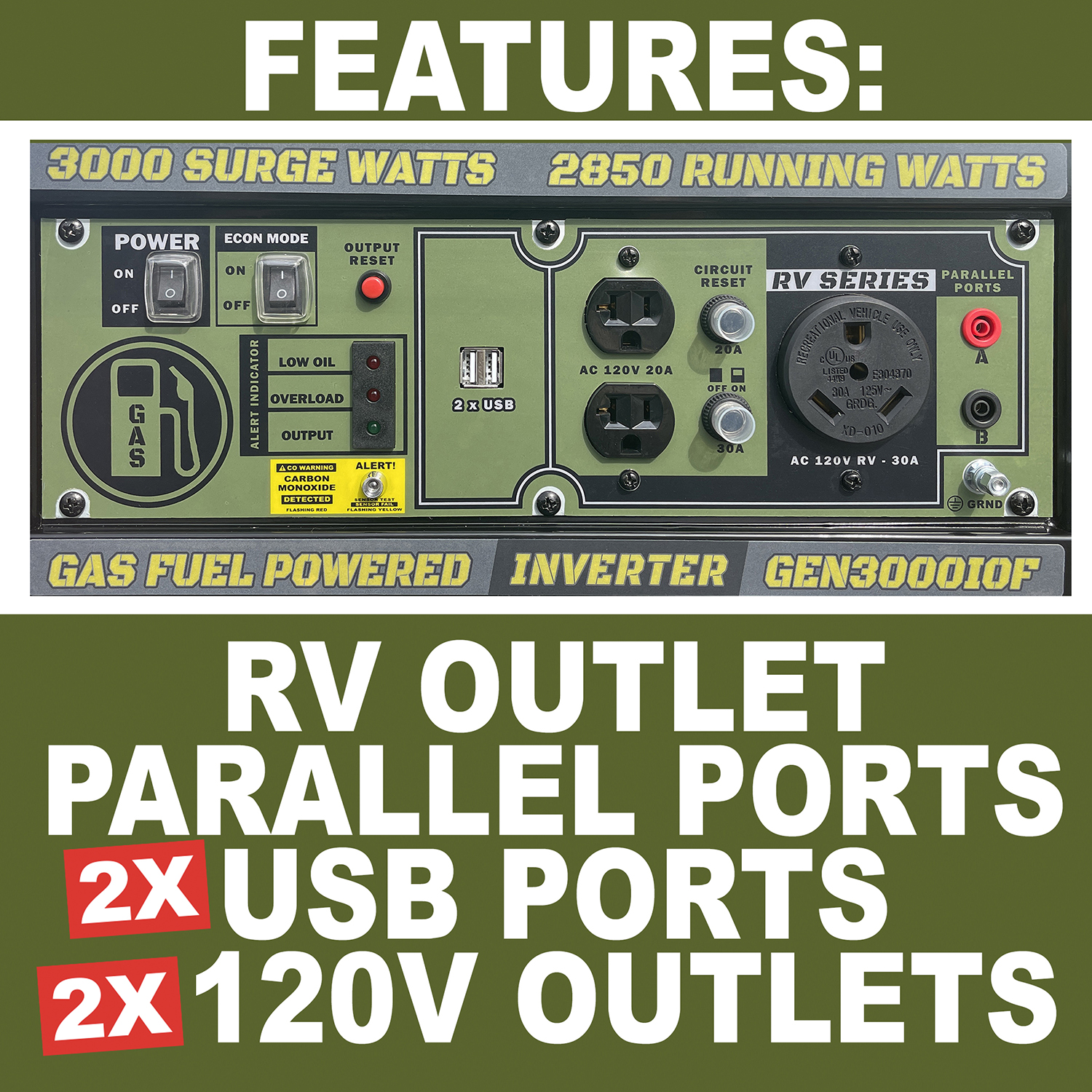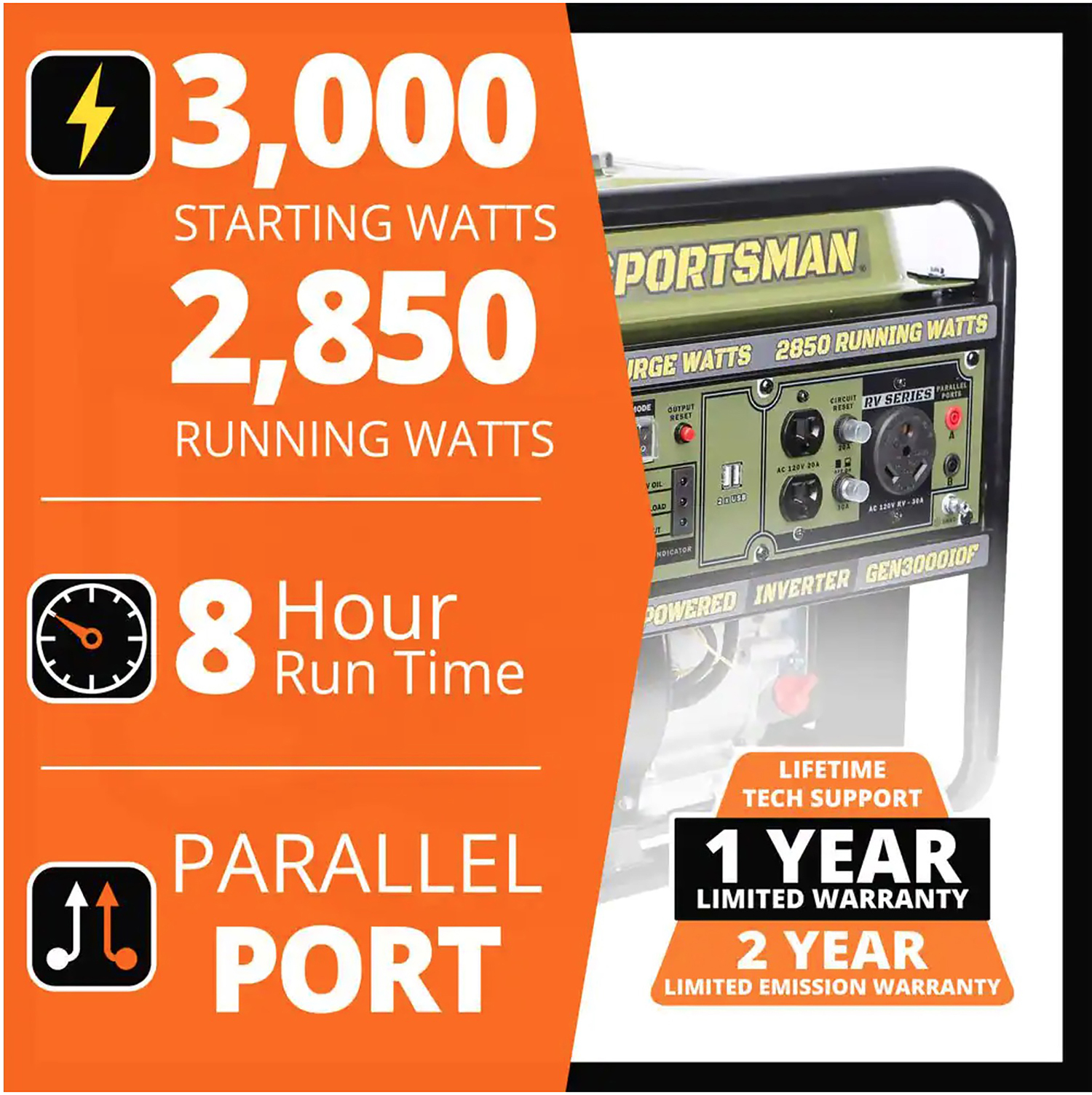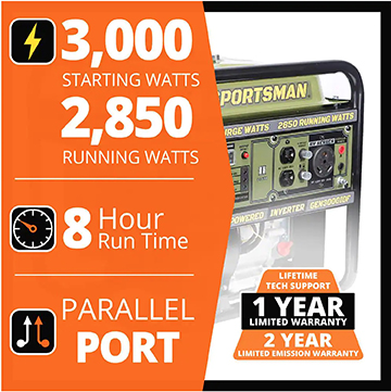 • 3000 Surge Watts / 2850 Running Watts