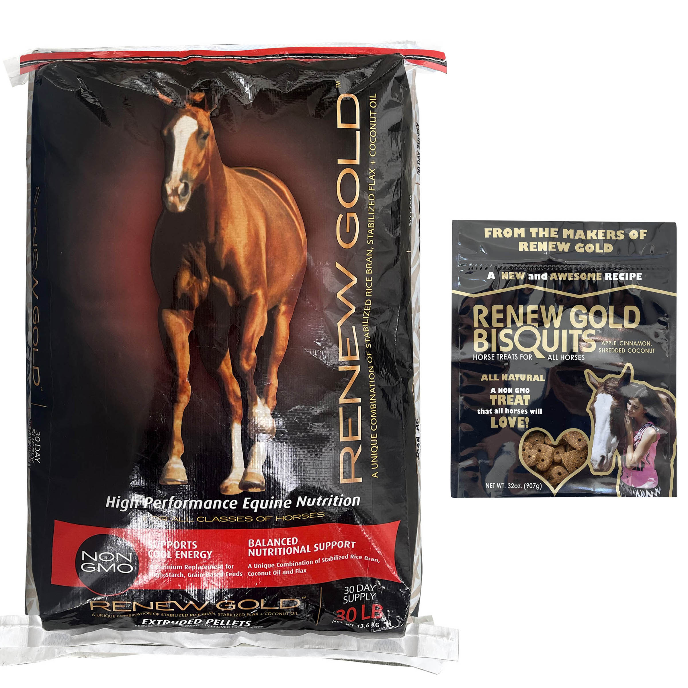 Renew Gold is a unique formulation of energy dense, low starch, premium quality Non-GMO ingredients designed to be fed at a rate of 1/2 pound to 1 1/2 pounds daily.