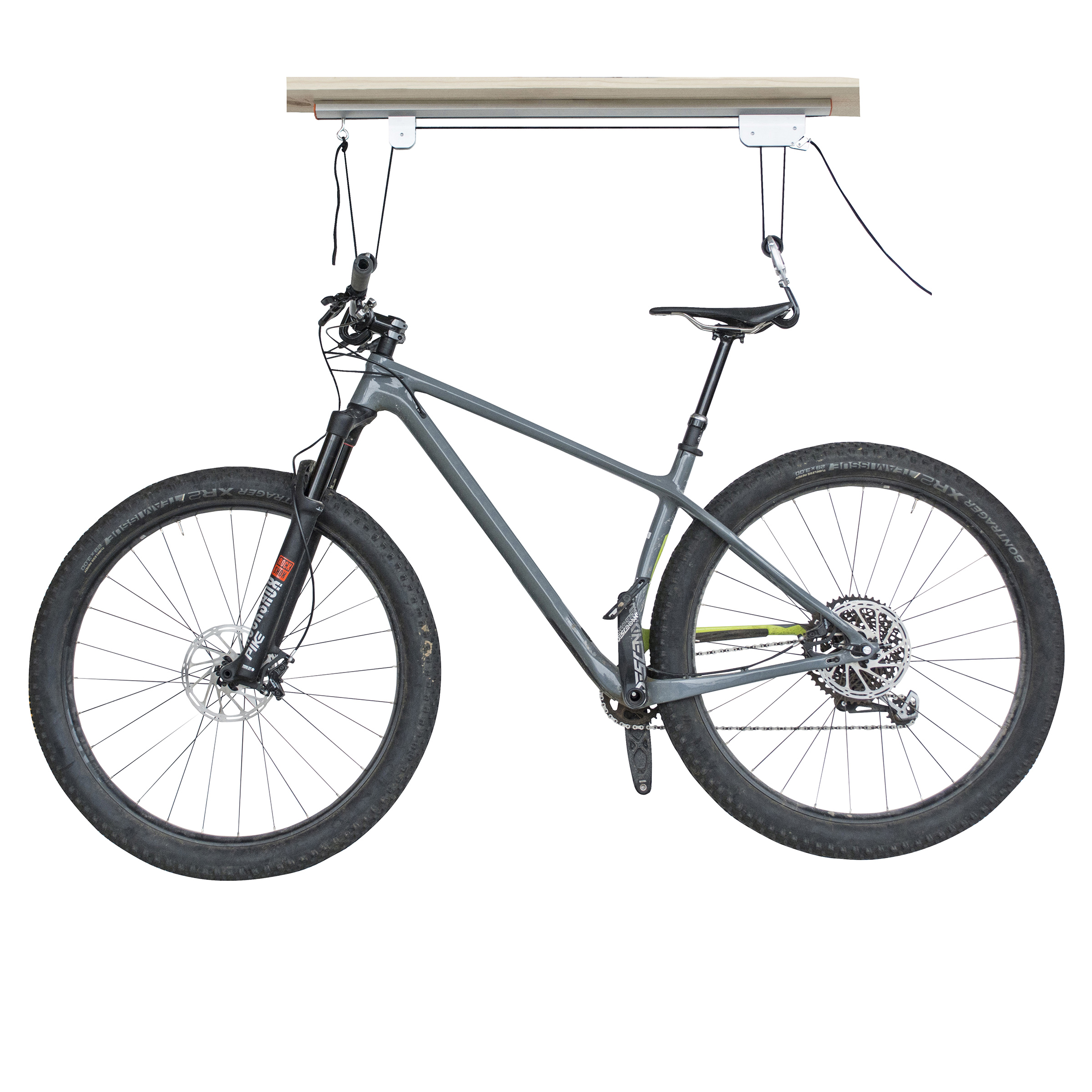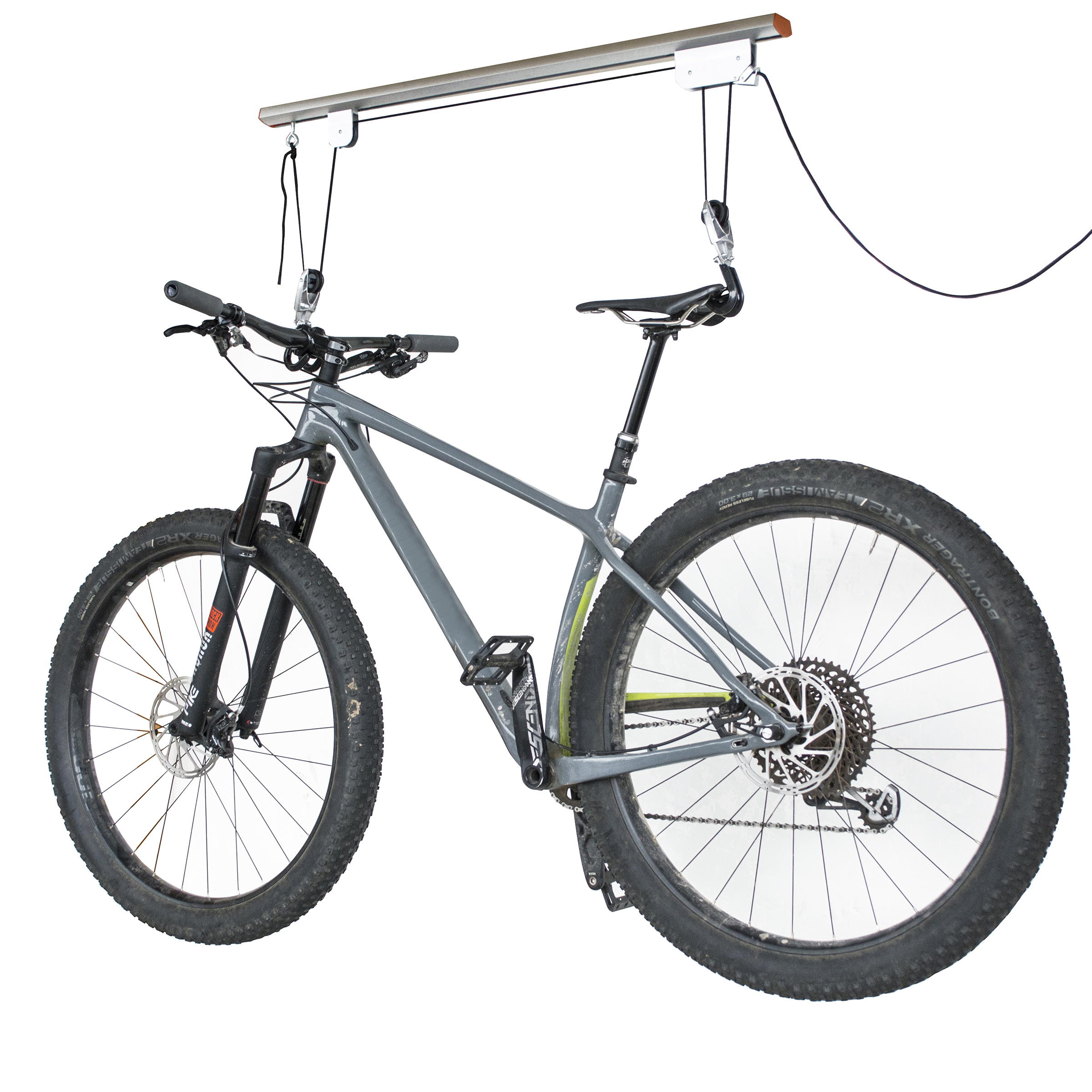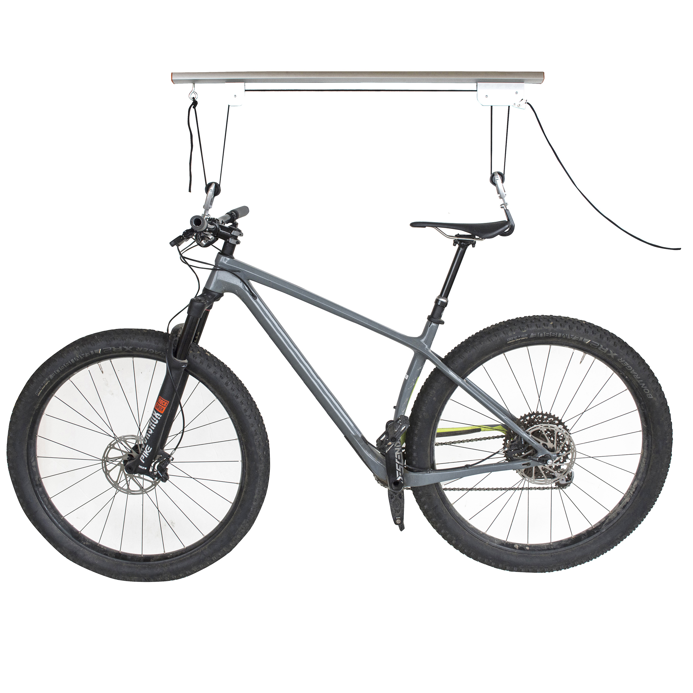 • Pulley locking mechanism will lift your bike out of the way, providing easy storage.