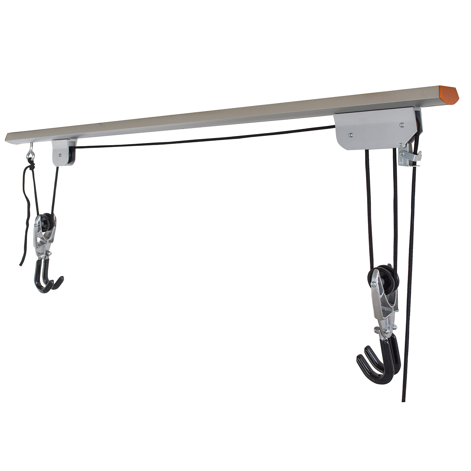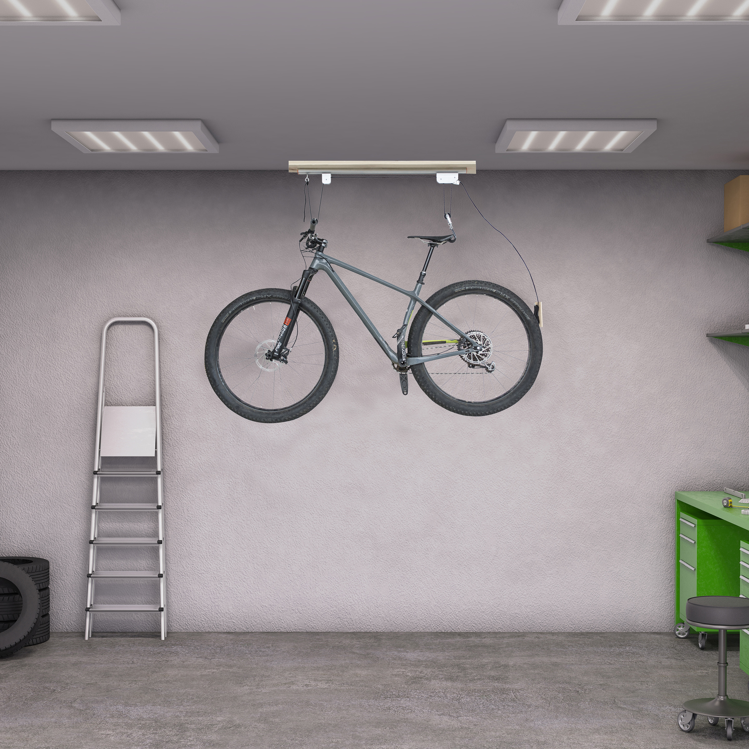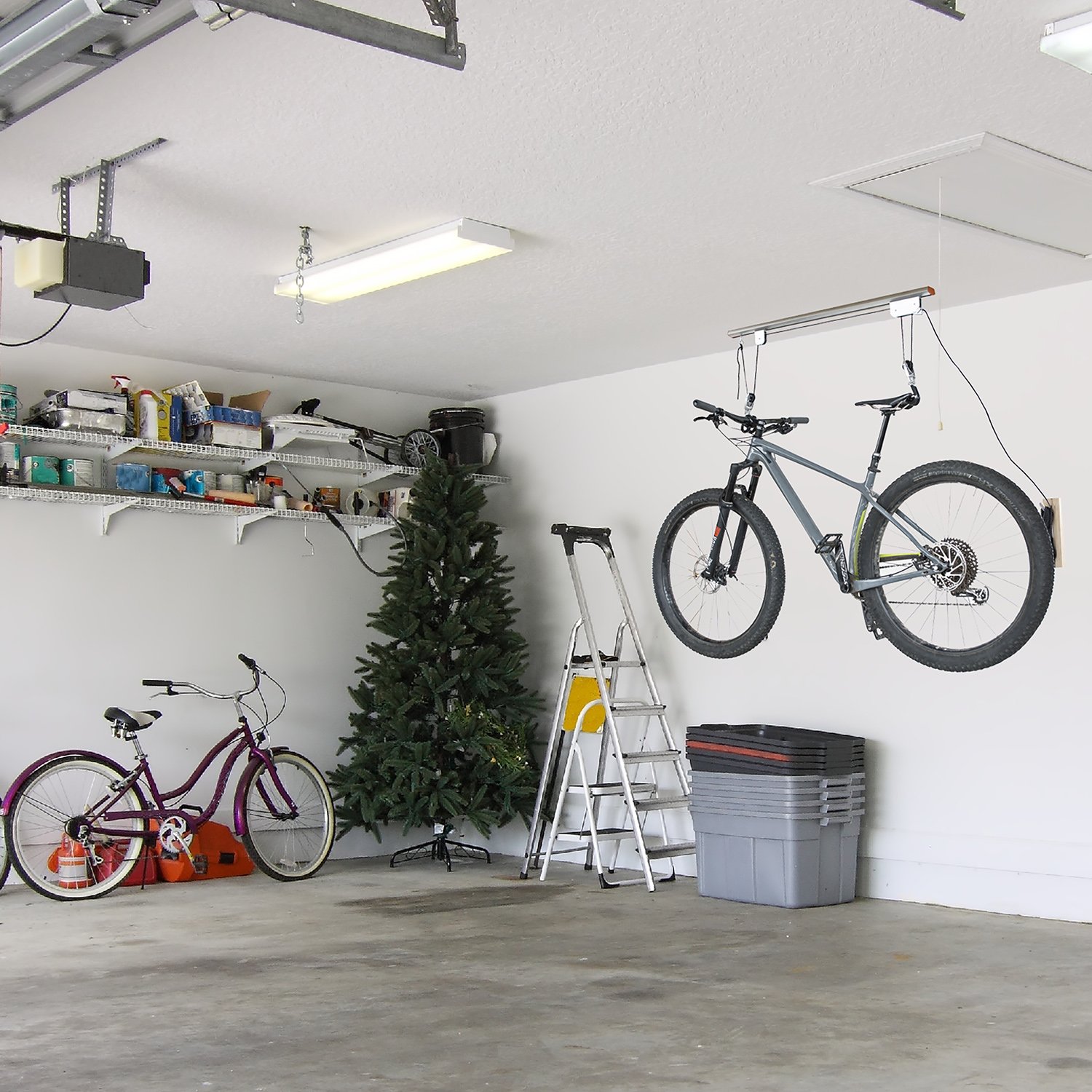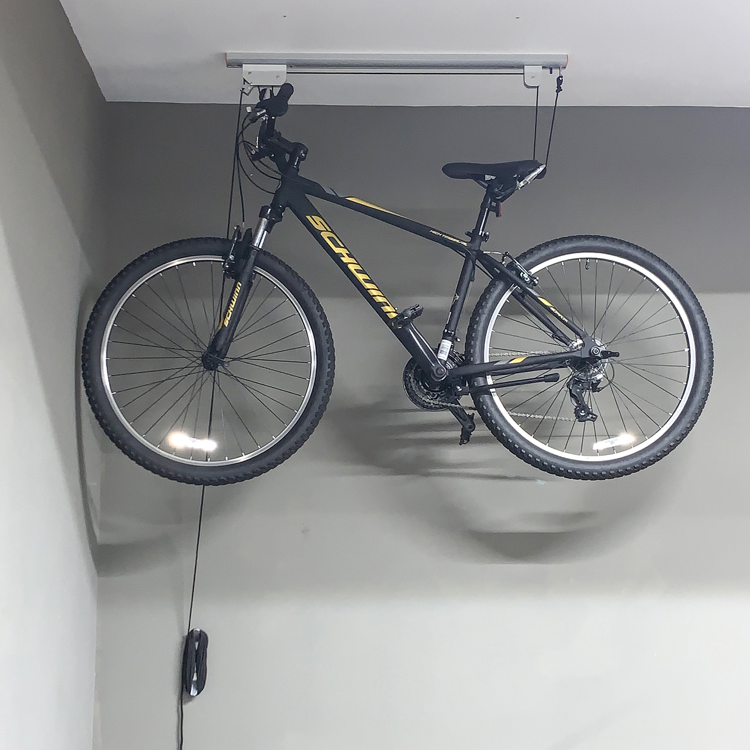 • Pulley locking mechanism will lift your bike out of the way, providing easy storage.