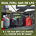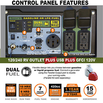 • Engine Run Time: 6 hours @ 50% Load on 20 lbs of LPG Fuel