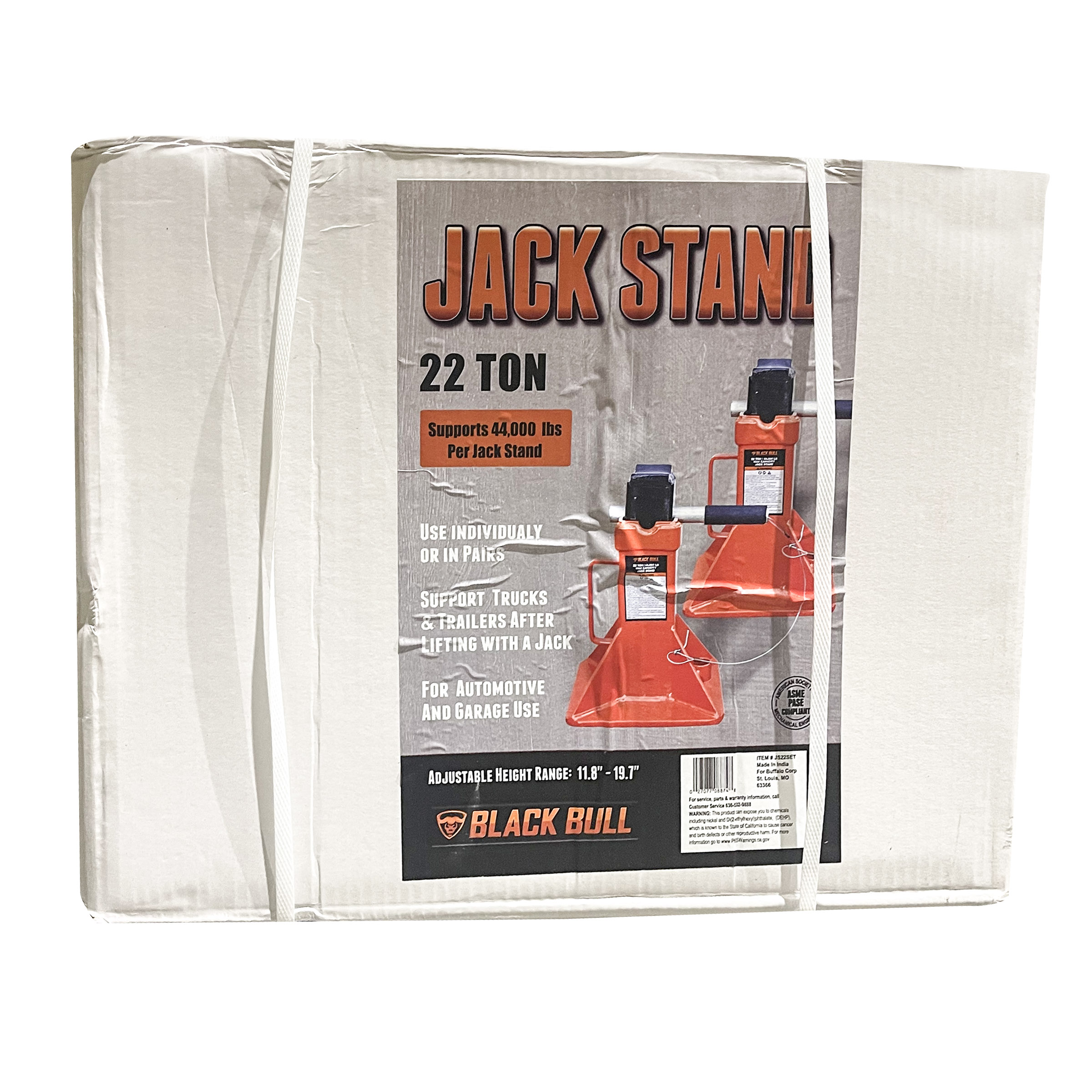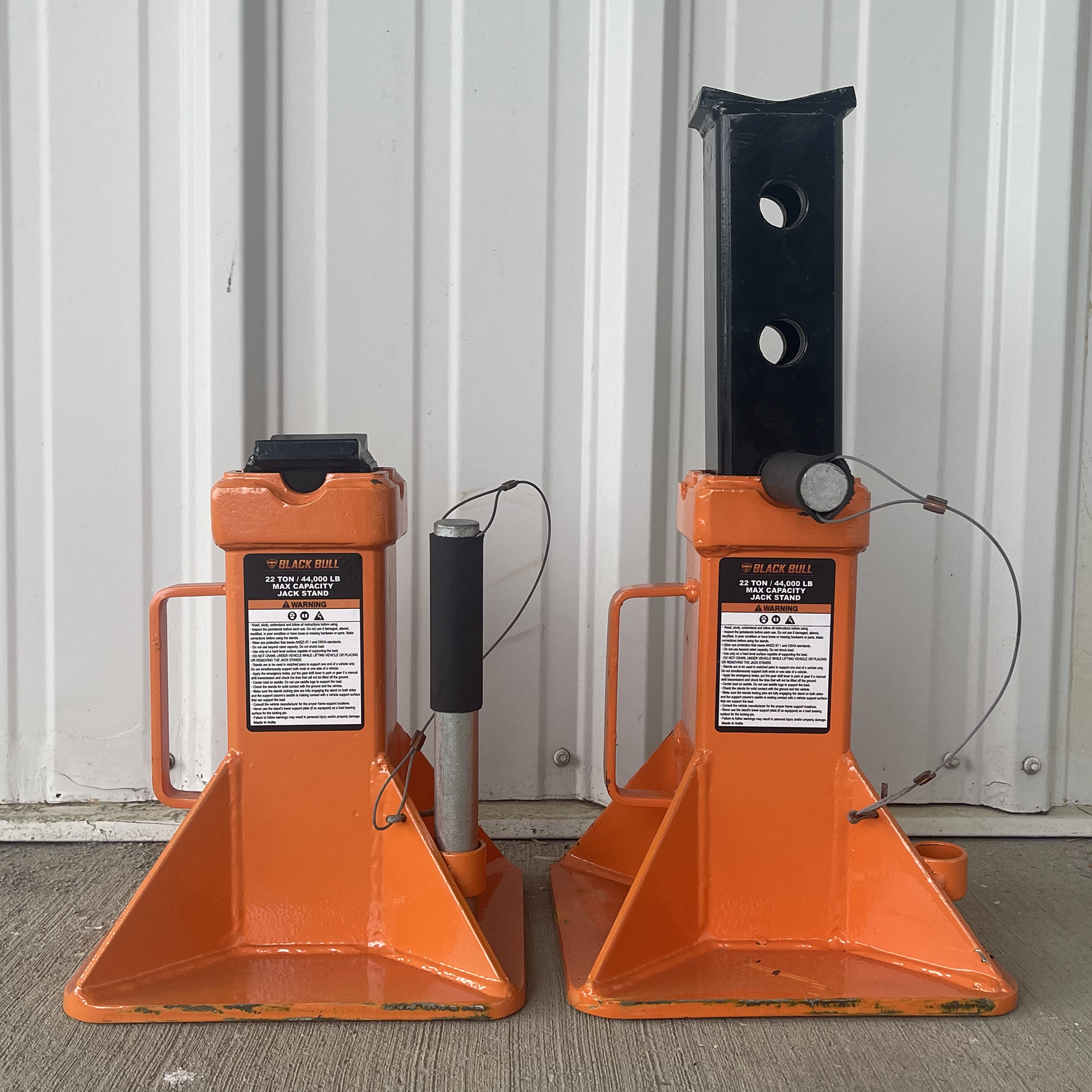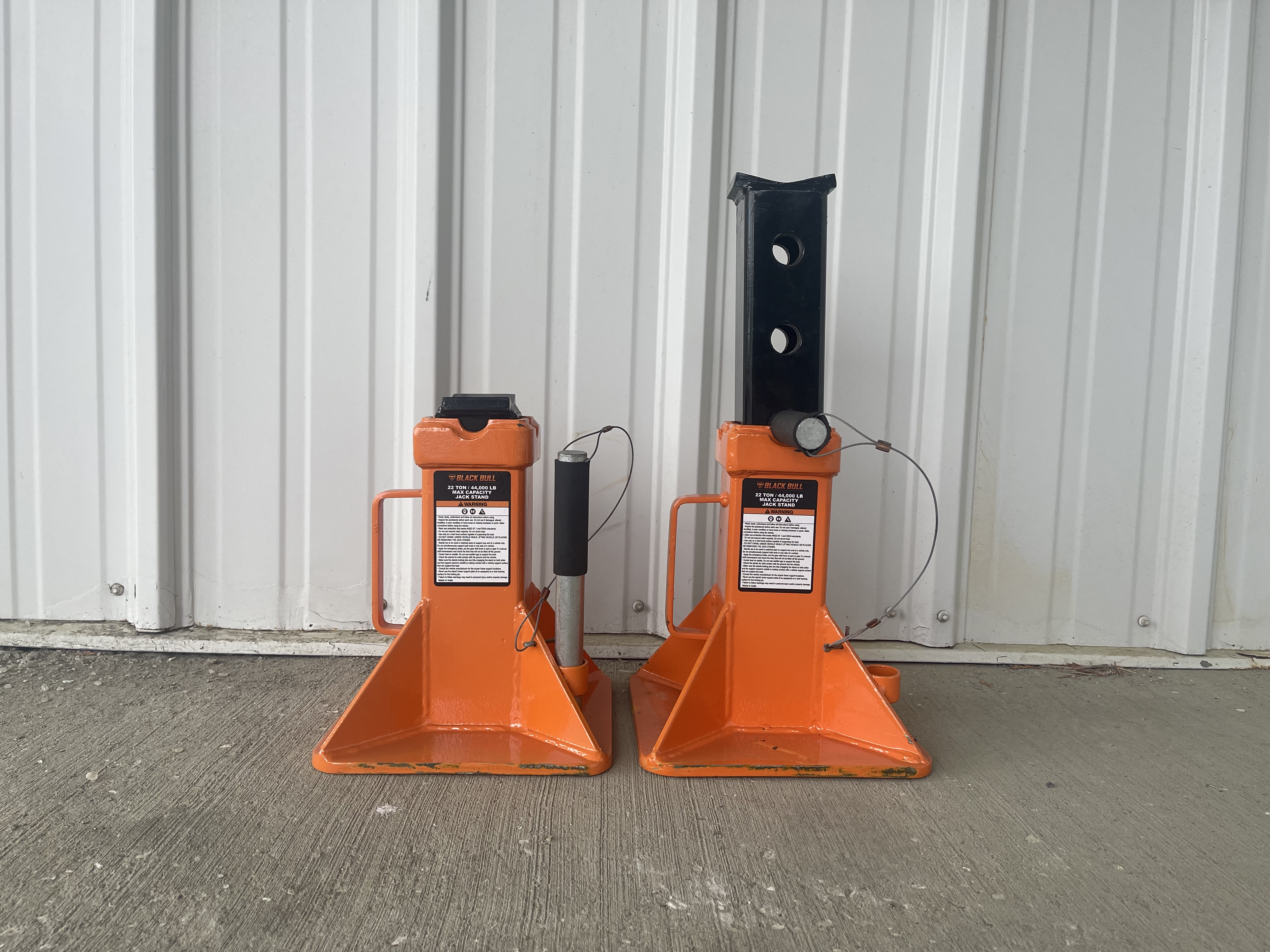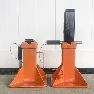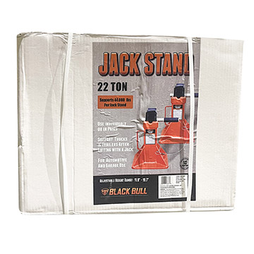 The Jack Stands feature Large saddle and base for stability. Plus they include an easy-to-use ratcheting system. This makes allows quick height adjustments. Use only in pairs. Self-locking ratchet with locking pin for added safety. Steel base construction. 22 ton (44,000 lb) max capacity.